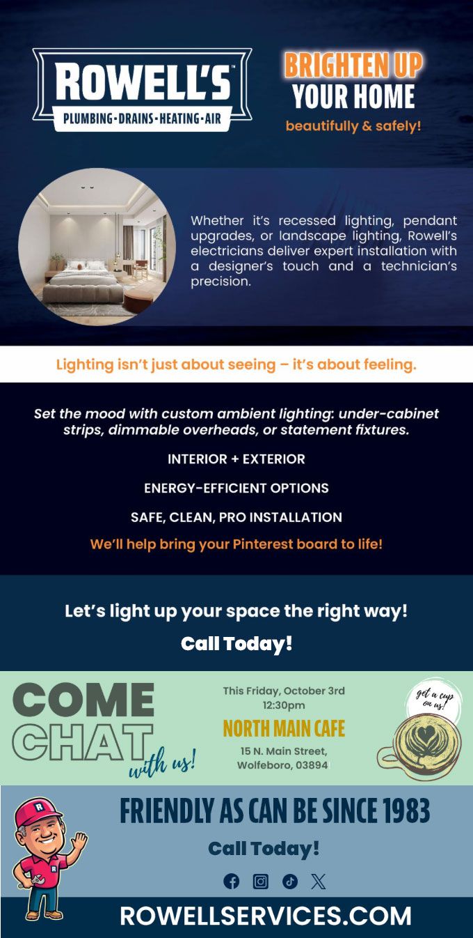 "Friendly As Can Be Since 1983!" When you need help with your plumbing, drains, heating, cooling or electrical in Barnstead, you can always rely on Rowell's Services! Call us now or book online!