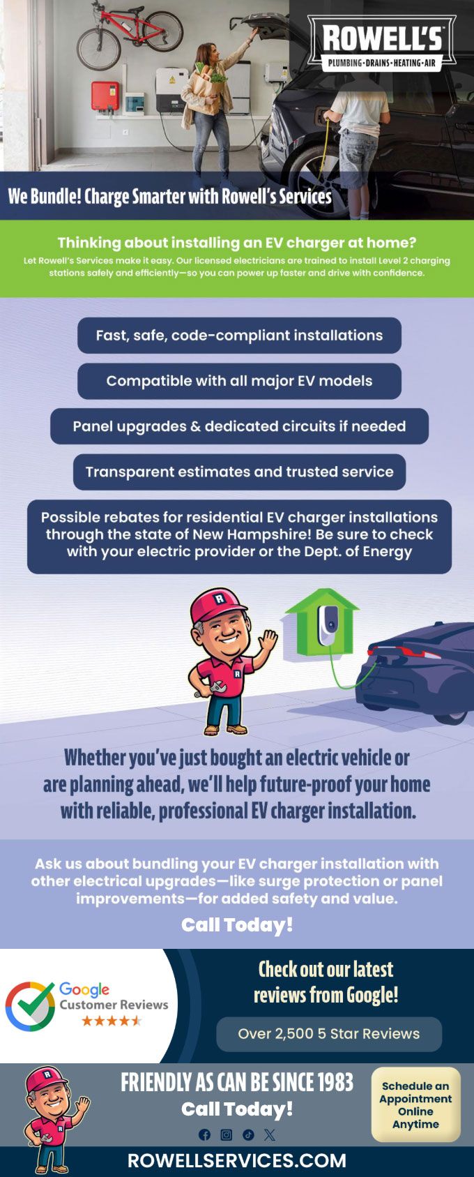 Let Rowell's Services make it easy. Our licensed electricians are trained to install Level 2 charging stations safely and efficiently—so you can power up faster and drive with confidence.
